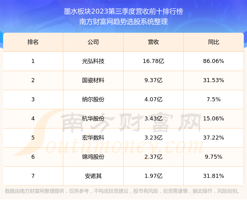 按照南方财富网趋势选股系统统计,该股所属板块为墨水板块,该板块共有7只股票,宏华数科2023第三季度营收在该板块中排名为第5名,该板块2023第三季度营收排名前十的股票如下表: