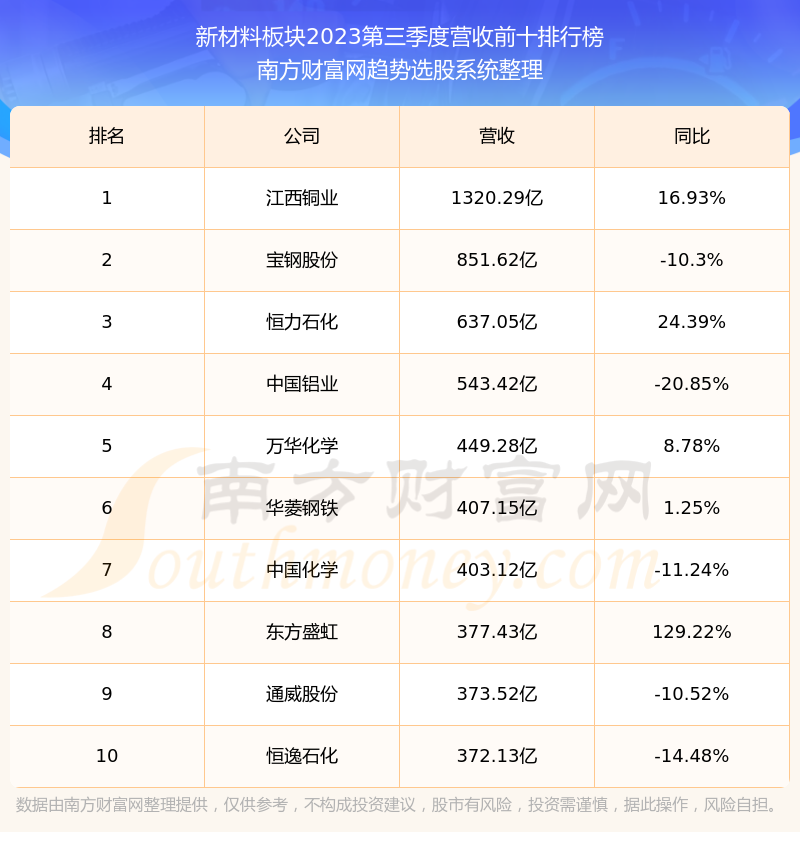按照南方财富网趋势选股系统统计,该股所属板块为新材料板块,该板块共有543只股票,苏博特2023第三季度营收在该板块中排名为第220名,该板块2023第三季度营收排名前十的股票如下表: