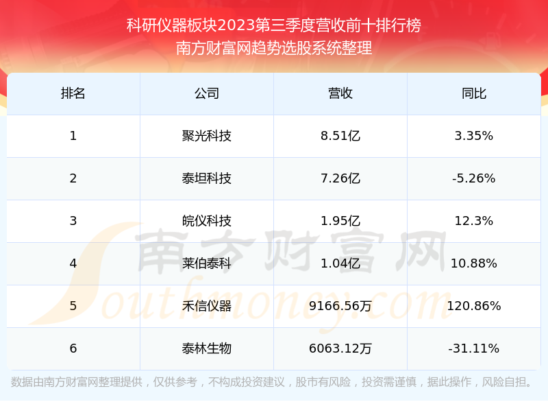 按照南方财富网趋势选股系统统计,该股所属板块为科研仪器板块,该板块共有6只股票,泰坦科技2023第三季度营收在该板块中排名为第2名,该板块2023第三季度营收排名前十的股票如下表: