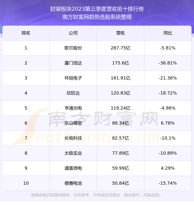 按照南方财富网趋势选股系统统计,该股所属板块为封装板块,该板块共有54只股票,甬矽电子2023第三季度营收在该板块中排名为第54名,该板块2023第三季度营收排名前十的股票如下表: