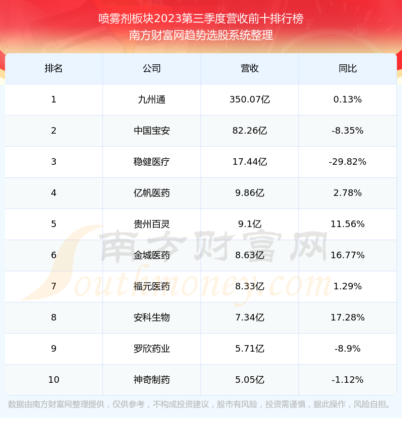 按照南方财富网趋势选股系统统计,该股所属板块为喷雾剂板块,该板块共有17只股票,贵州三力2023第三季度营收在该板块中排名为第12名,该板块2023第三季度营收排名前十的股票如下表: