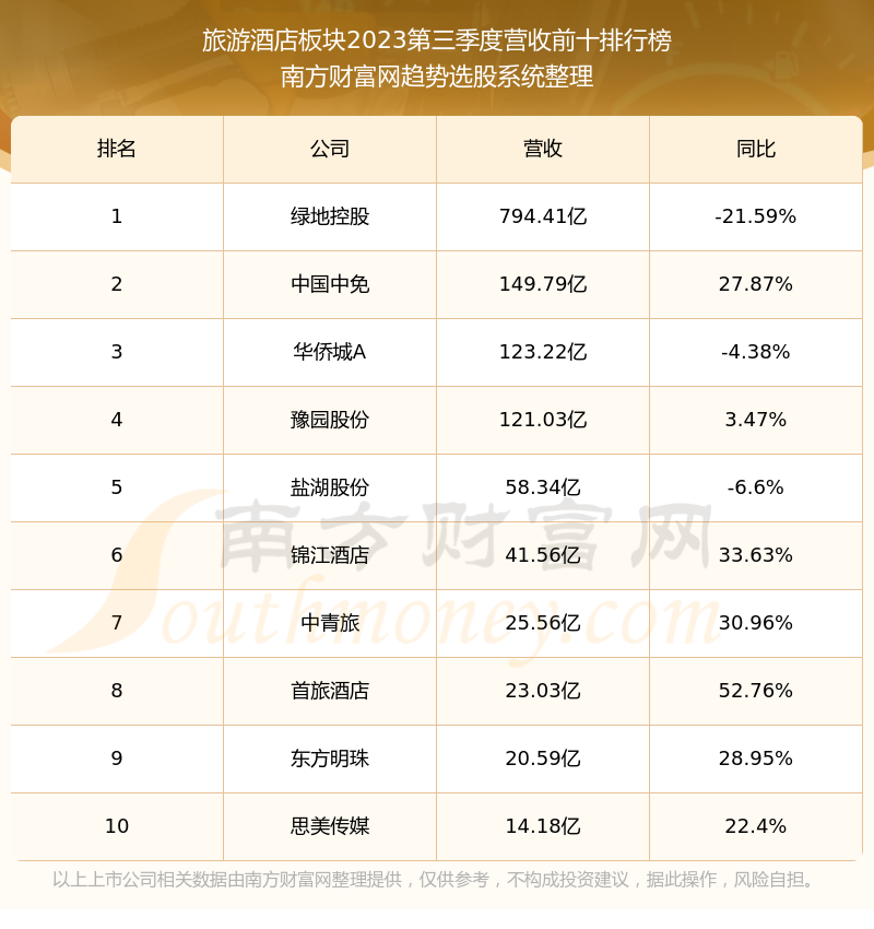 按照南方财富网趋势选股系统统计,该股所属板块为旅游酒店板块,该板块共有62只股票,大连圣亚2023第三季度营收在该板块中排名为第42名,该板块2023第三季度营收排名前十的股票如下表: