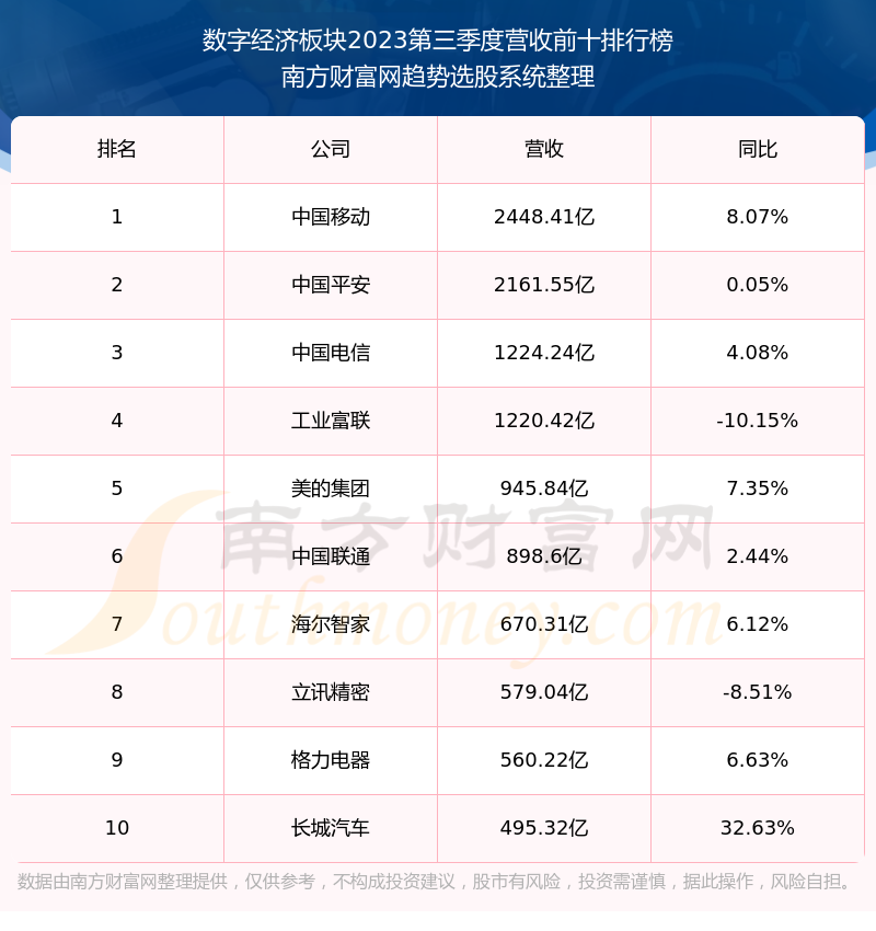 按照南方财富网趋势选股系统统计,该股所属板块为数字经济板块,该板块共有349只股票,同方股份2023第三季度营收在该板块中排名为第40名,该板块2023第三季度营收排名前十的股票如下表: