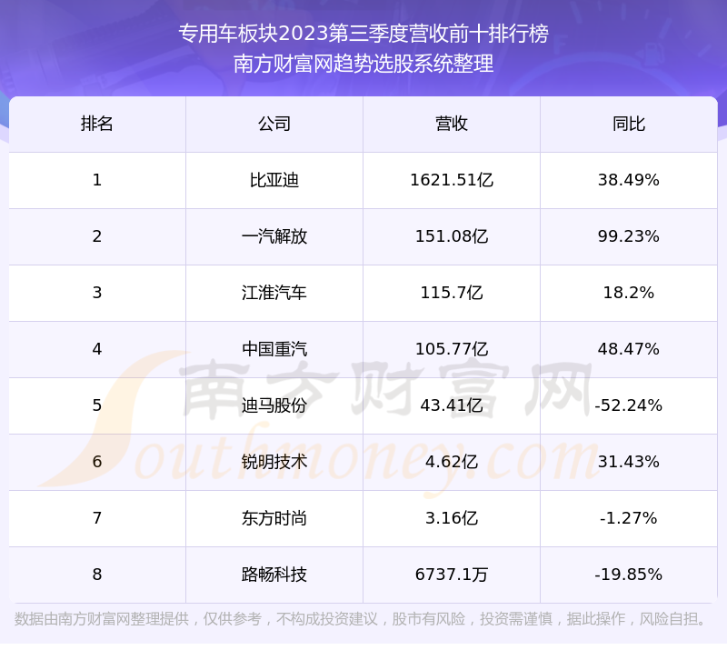 按照南方财富网趋势选股系统统计,该股所属板块为专用车板块,该板块共有8只股票,北方导航2023第三季度营收在该板块中排名为第8名,该板块2023第三季度营收排名前十的股票如下表: