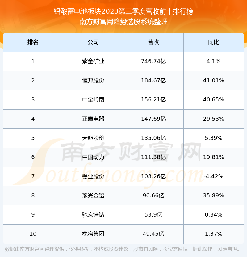 按照南方财富网趋势选股系统统计,该股所属板块为铅酸蓄电池板块,该板块共有24只股票,万里股份2023第三季度营收在该板块中排名为第23名,该板块2023第三季度营收排名前十的股票如下表: