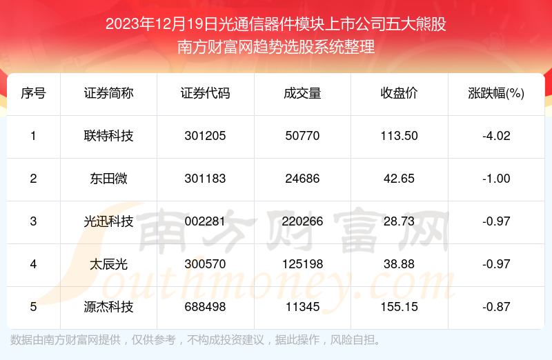 以上内容就是对【股票配资平台 板块复盘|2023年12月19日光通信器件模块上市公司五大熊股】的解答,如果解决了您的问题欢迎把链接分享给朋友(https://www.youge168.com/mod_article-article_content-article_id-52274.html)