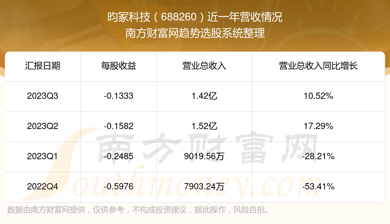 财报显示,2023年第三季度昀冢科技营收1.42亿元,同比增长10.52%,净利润-1570.21万元,同比增长-53.92%。