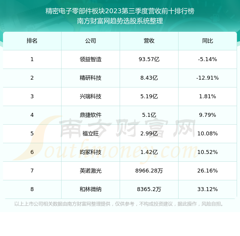 按照南方财富网趋势选股系统统计,该股所属板块为精密电子零部件板块,该板块共有8只股票,昀冢科技2023第三季度营收在该板块中排名为第6名,该板块2023第三季度营收排名前十的股票如下表:
