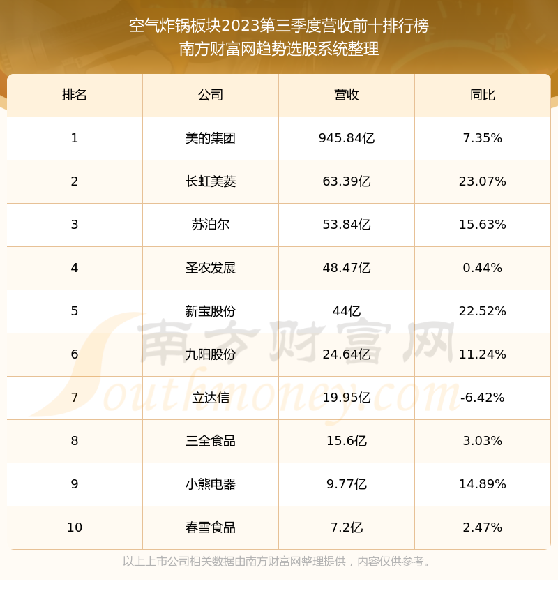 按照南方财富网趋势选股系统统计,该股所属板块为空气炸锅板块,该板块共有17只股票,比依股份2023第三季度营收在该板块中排名为第12名,该板块2023第三季度营收排名前十的股票如下表: