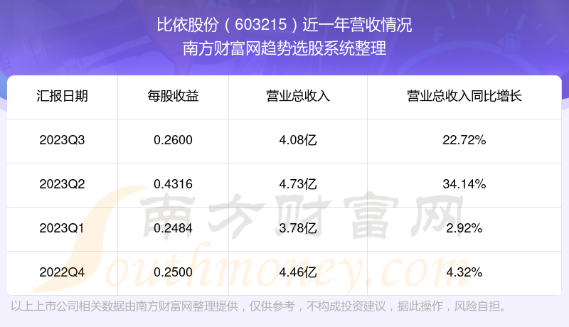 比依股份2023年第三季度公司实现营业收入4.08亿元,同比22.72%;归母净利润4852.43万元,同比-12.49%。
