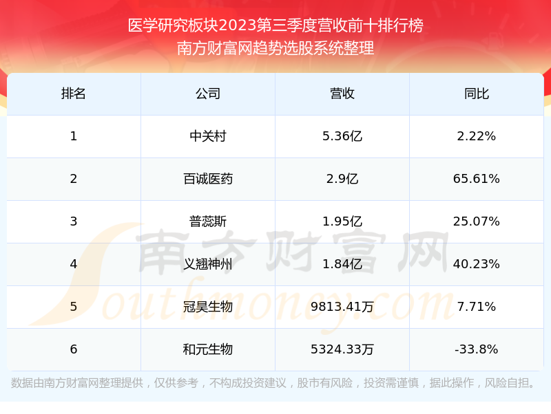 按照南方财富网趋势选股系统统计,该股所属板块为医学研究板块,该板块共有6只股票,诺禾致源2023第三季度营收在该板块中排名为第6名,该板块2023第三季度营收排名前十的股票如下表: