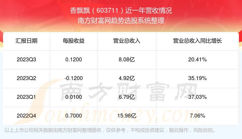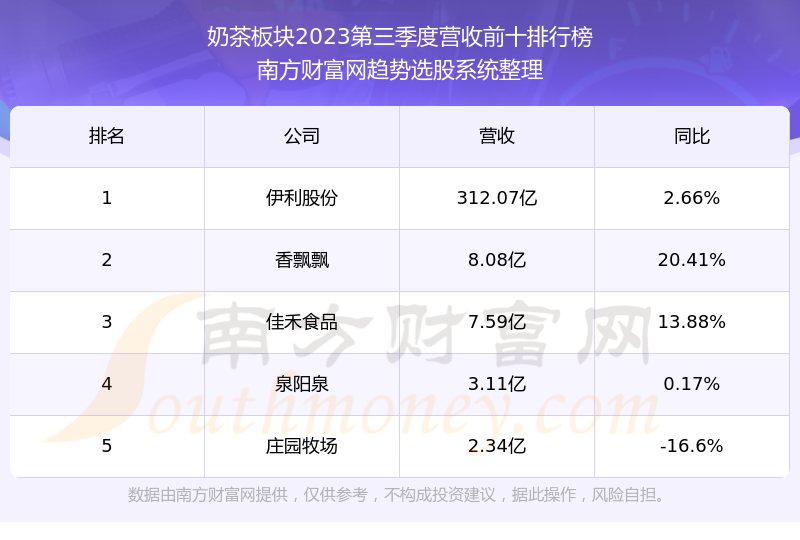 按照南方财富网趋势选股系统统计,该股所属板块为奶茶板块,该板块共有5只股票,香飘飘2023第三季度营收在该板块中排名为第2名,该板块2023第三季度营收排名前十的股票如下表: