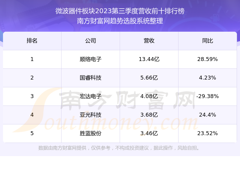 按照南方财富网趋势选股系统统计,该股所属板块为微波器件板块,该板块共有5只股票,国光电气2023第三季度营收在该板块中排名为第5名,该板块2023第三季度营收排名前十的股票如下表: