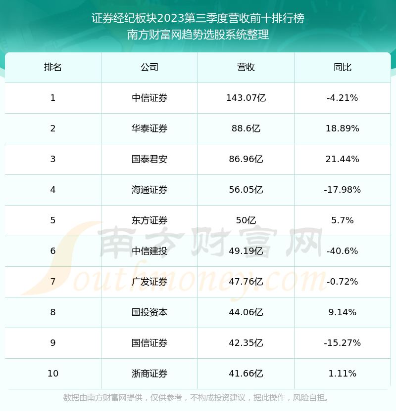 按照南方财富网趋势选股系统统计,该股所属板块为证券经纪板块,该板块共有36只股票,财达证券2023第三季度营收在该板块中排名为第28名,该板块2023第三季度营收排名前十的股票如下表:
