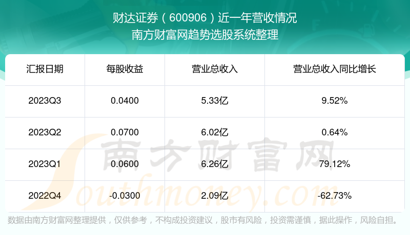 财达证券2023年第三季度公司实现营业收入5.33亿元,同比9.52%;归母净利润1.46亿元,同比15.74%。