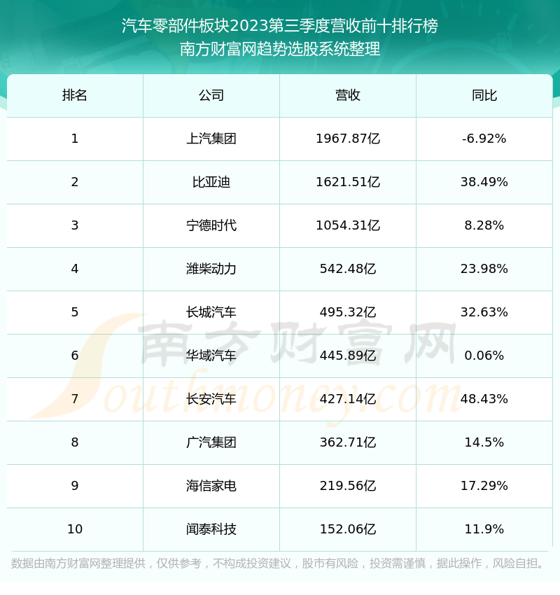 按照南方财富网趋势选股系统统计,该股所属板块为汽车零部件板块,该板块共有468只股票,科华控股2023第三季度营收在该板块中排名为第216名,该板块2023第三季度营收排名前十的股票如下表: