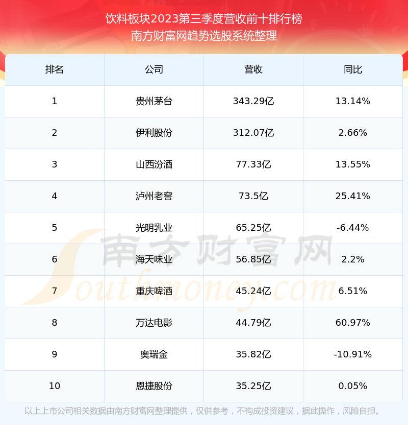 按照南方财富网趋势选股系统统计,该股所属板块为饮料板块,该板块共有117只股票,东鹏饮料2023第三季度营收在该板块中排名为第11名,该板块2023第三季度营收排名前十的股票如下表: