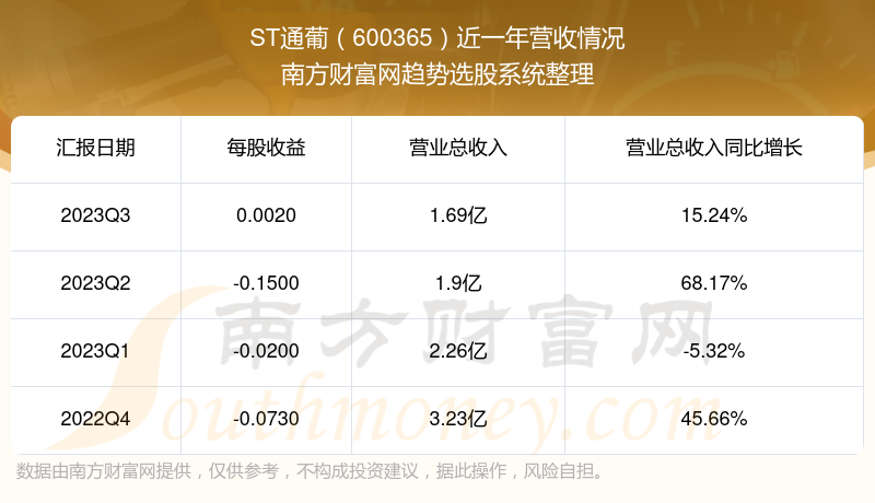 A股上市公司ST通葡(代码:600365)发布2023年第三季度财报,公司2023年第三季度归属于上市公司股东的净利润为-31.02万元,净利润同比增长97.79%,环比增长99.5%。