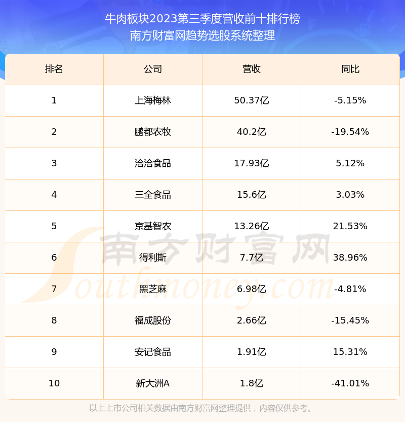 按照南方财富网趋势选股系统统计,该股所属板块为牛肉板块,该板块共有12只股票,味知香2023第三季度营收在该板块中排名为第12名,该板块2023第三季度营收排名前十的股票如下表: