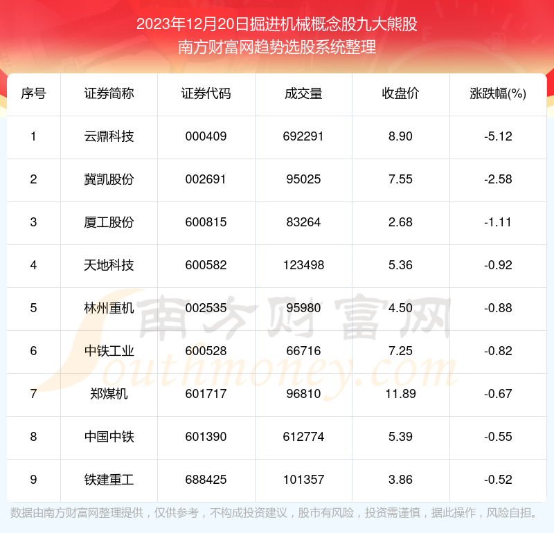 截止2023年12月20日,个股表现方面,掘进机械概念股当日领跌股为云鼎科技(000409),该股当日报收8.90,上涨-5.12%,成交量69.23万。冀凯股份(002691)以下跌-2.58%紧随其后,该股当日成交量9.5万。此外,厦工股份(600815)、天地科技(600582)、林州重机(002535)均进入当日掘进机械概念股熊股之列。