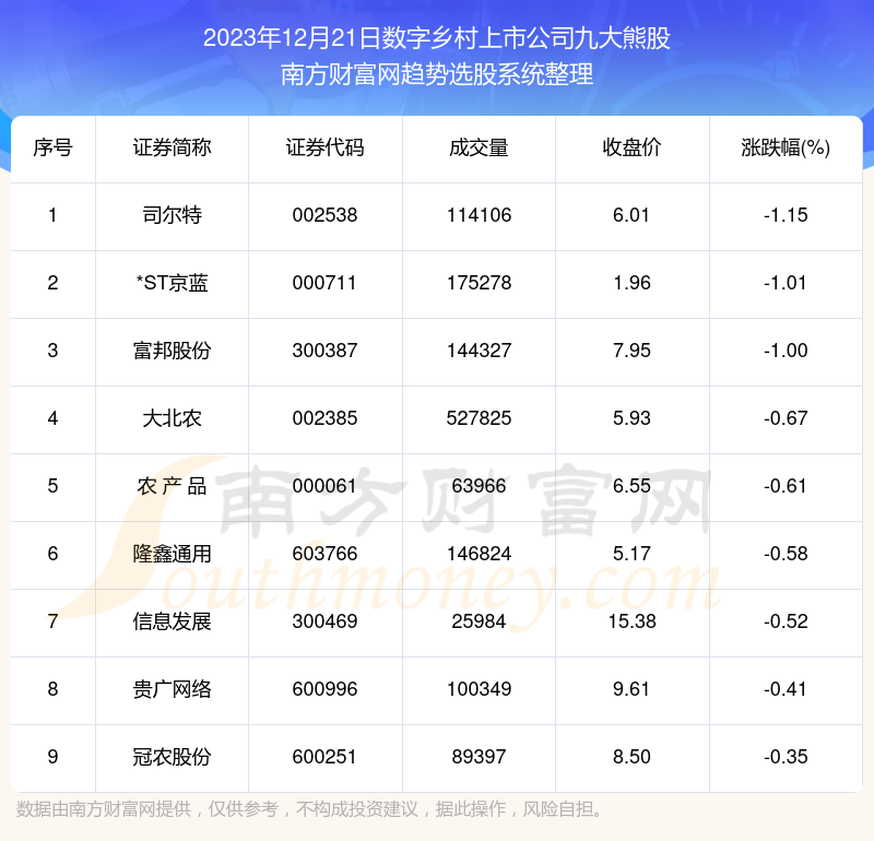 截止2023年12月21日,个股表现方面,数字乡村上市公司当日领跌股为司尔特(002538),该股当日报收6.01,上涨-1.15%,成交量11.41万。*ST京蓝(000711)以下跌-1.01%紧随其后,该股当日成交量17.53万。此外,富邦股份(300387)、大北农(002385)、农 产 品(000061)均进入当日数字乡村上市公司熊股之列。