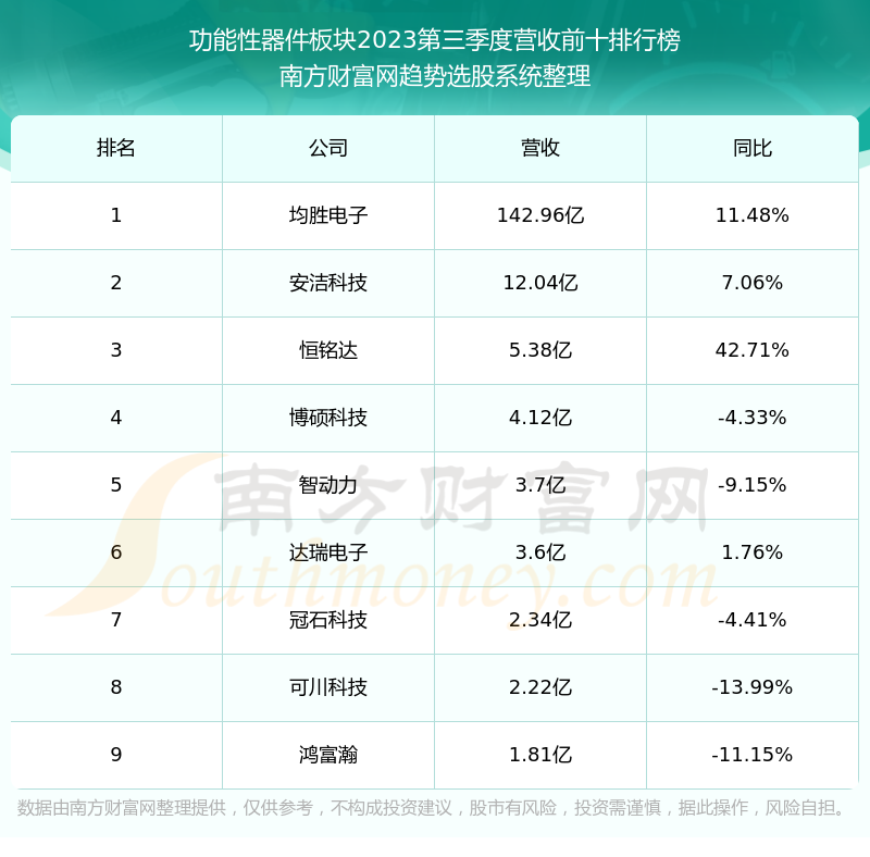 按照南方财富网趋势选股系统统计,该股所属板块为功能性器件板块,该板块共有9只股票,可川科技2023第三季度营收在该板块中排名为第8名,该板块2023第三季度营收排名前十的股票如下表: