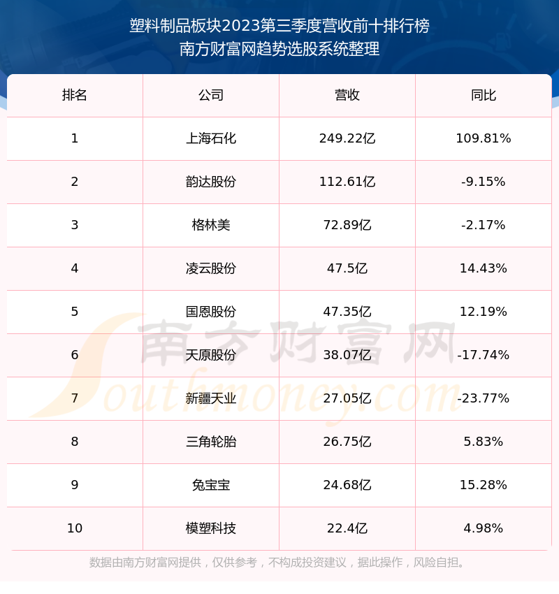 按照南方财富网趋势选股系统统计,该股所属板块为塑料制品板块,该板块共有73只股票,永悦科技2023第三季度营收在该板块中排名为第73名,该板块2023第三季度营收排名前十的股票如下表: