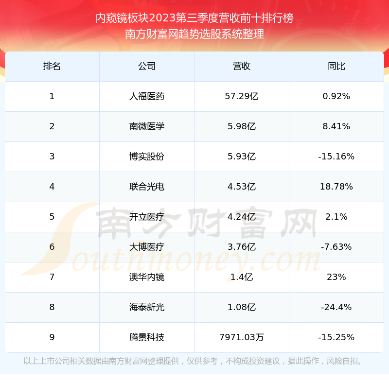 按照南方财富网趋势选股系统统计,该股所属板块为内窥镜板块,该板块共有9只股票,澳华内镜2023第三季度营收在该板块中排名为第7名,该板块2023第三季度营收排名前十的股票如下表: