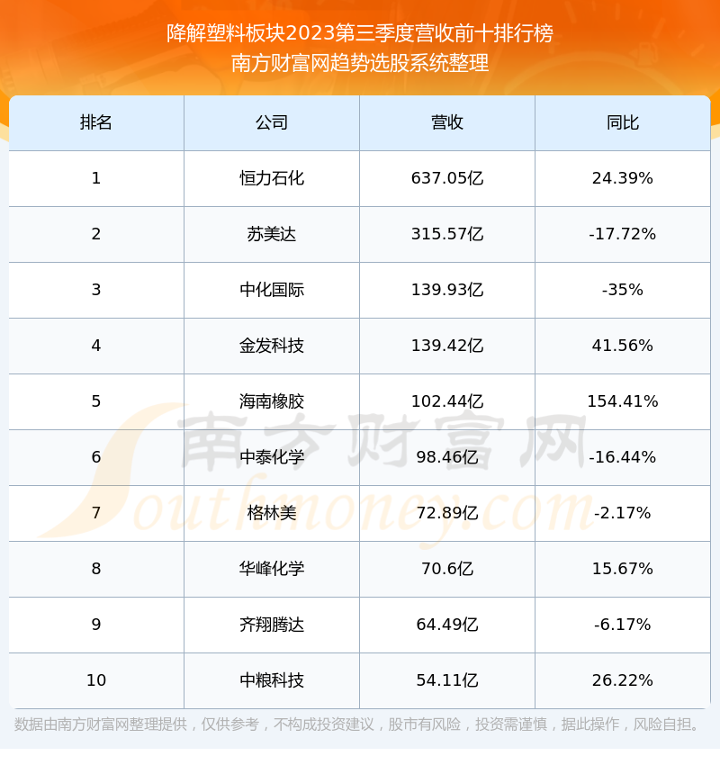 按照南方财富网趋势选股系统统计,该股所属板块为降解塑料板块,该板块共有61只股票,冠豪高新2023第三季度营收在该板块中排名为第22名,该板块2023第三季度营收排名前十的股票如下表: