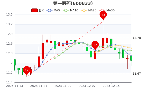 12月22日消息,第一医药开盘报价12.23元,收盘于12.080元,跌0.66%。今年来涨幅下跌-5.88%,市盈率18.88。