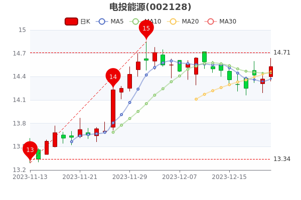 12月22日收盘消息,电投能源(002128)涨1.11%,报14.530元,成交额1.77亿元。