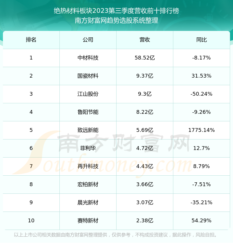 按照南方财富网趋势选股系统统计,该股所属板块为绝热材料板块,该板块共有12只股票,赛特新材2023第三季度营收在该板块中排名为第10名,该板块2023第三季度营收排名前十的股票如下表: