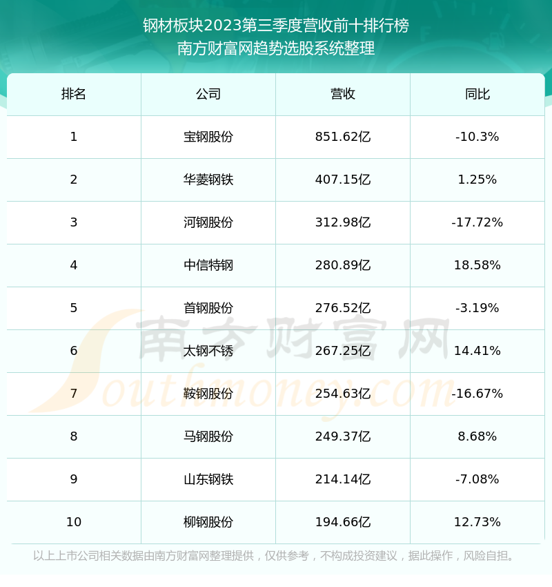 按照南方财富网趋势选股系统统计,该股所属板块为钢材板块,该板块共有30只股票,云维股份2023第三季度营收在该板块中排名为第30名,该板块2023第三季度营收排名前十的股票如下表:
