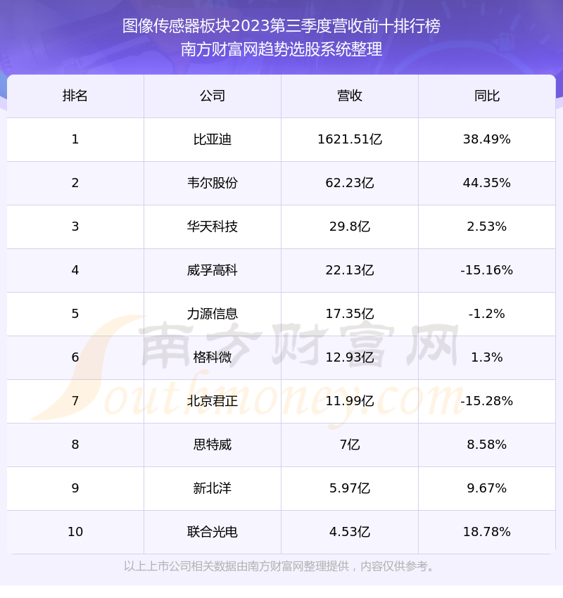 按照南方财富网趋势选股系统统计,该股所属板块为图像传感器板块,该板块共有15只股票,格科微2023第三季度营收在该板块中排名为第6名,该板块2023第三季度营收排名前十的股票如下表: