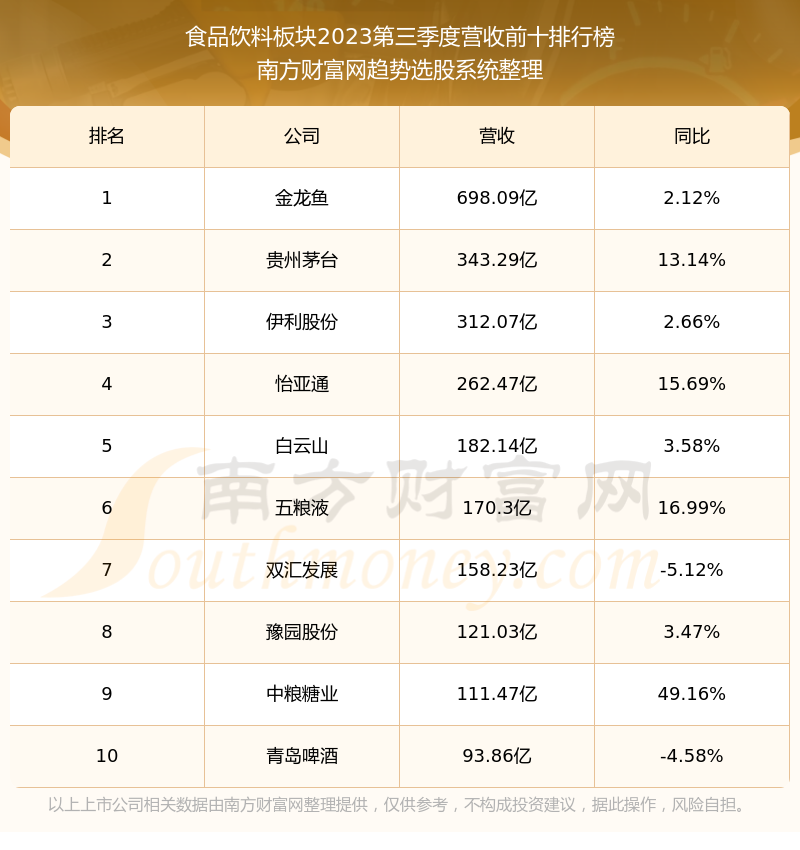 按照南方财富网趋势选股系统统计,该股所属板块为食品饮料板块,该板块共有232只股票,千禾味业2023第三季度营收在该板块中排名为第93名,该板块2023第三季度营收排名前十的股票如下表: