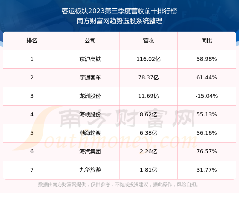 按照南方财富网趋势选股系统统计,该股所属板块为客运板块,该板块共有7只股票,京沪高铁2023第三季度营收在该板块中排名为第1名,该板块2023第三季度营收排名前十的股票如下表: