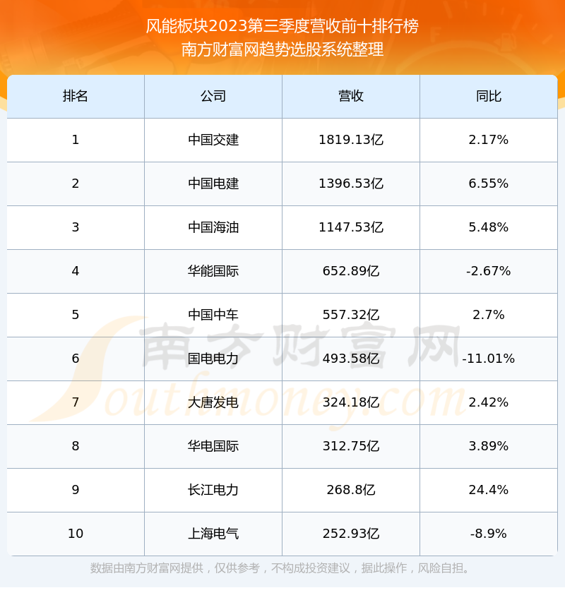 按照南方财富网趋势选股系统统计,该股所属板块为风能板块,该板块共有226只股票,福能股份2023第三季度营收在该板块中排名为第53名,该板块2023第三季度营收排名前十的股票如下表: