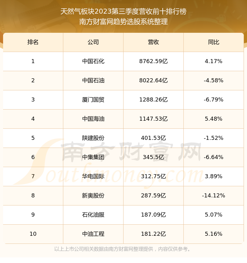 按照南方财富网趋势选股系统统计,该股所属板块为天然气板块,该板块共有159只股票,东方环宇2023第三季度营收在该板块中排名为第141名,该板块2023第三季度营收排名前十的股票如下表: