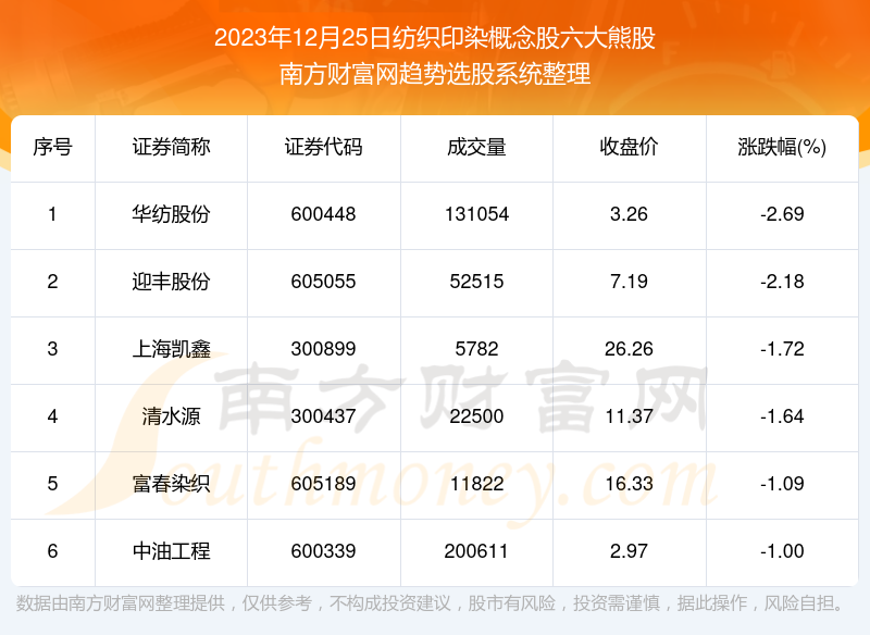 以上内容就是对【配资平台开户 【数据复盘】纺织印染概念股2023年12月25日六大熊股名单】的解答,如果解决了您的问题欢迎把链接分享给朋友(https://www.youge168.com/mod_article-article_content-article_id-52835.html)