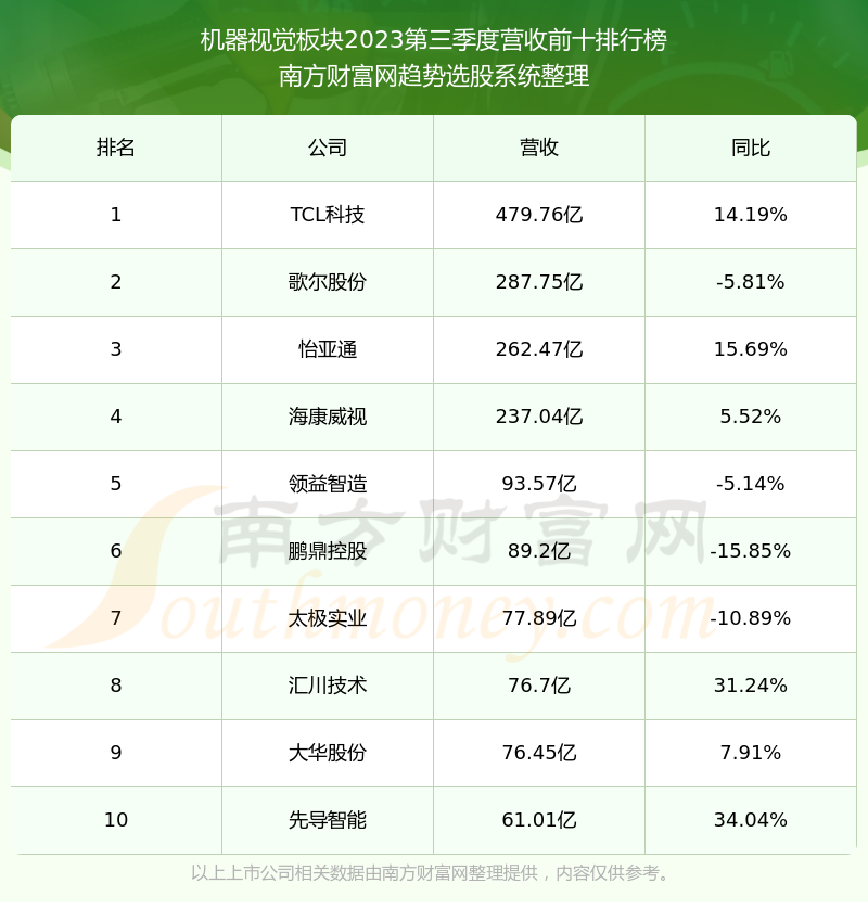 按照南方财富网趋势选股系统统计,该股所属板块为机器视觉板块,该板块共有152只股票,奥普特2023第三季度营收在该板块中排名为第92名,该板块2023第三季度营收排名前十的股票如下表:
