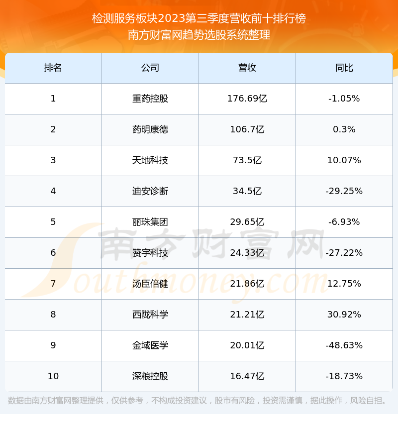 按照南方财富网趋势选股系统统计,该股所属板块为检测服务板块,该板块共有51只股票,国发股份2023第三季度营收在该板块中排名为第51名,该板块2023第三季度营收排名前十的股票如下表: