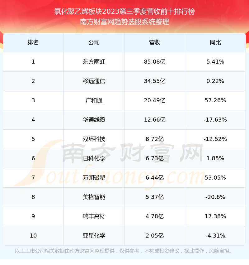 按照南方财富网趋势选股系统统计,该股所属板块为氯化聚乙烯板块,该板块共有11只股票,亚星化学2023第三季度营收在该板块中排名为第10名,该板块2023第三季度营收排名前十的股票如下表: