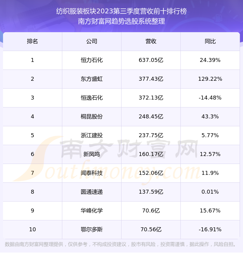按照南方财富网趋势选股系统统计,该股所属板块为纺织服装板块,该板块共有188只股票,上海三毛2023第三季度营收在该板块中排名为第121名,该板块2023第三季度营收排名前十的股票如下表:
