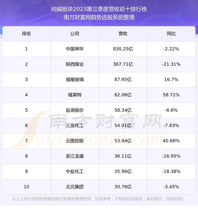 按照南方财富网趋势选股系统统计,该股所属板块为纯碱板块,该板块共有25只股票,金晶科技2023第三季度营收在该板块中排名为第15名,该板块2023第三季度营收排名前十的股票如下表: