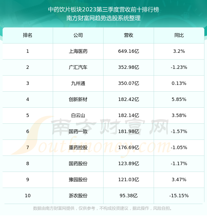 按照南方财富网趋势选股系统统计,该股所属板块为中药饮片板块,该板块共有84只股票,太龙药业2023第三季度营收在该板块中排名为第59名,该板块2023第三季度营收排名前十的股票如下表: