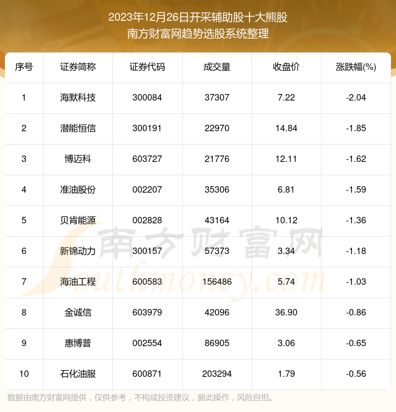 截止2023年12月26日,个股表现方面,开采辅助股当日领跌股为海默科技(300084),该股当日报收7.22,上涨-2.04%,成交量3.73万。潜能恒信(300191)以下跌-1.85%紧随其后,该股当日成交量2.3万。此外,博迈科(603727)、准油股份(002207)、贝肯能源(002828)均进入当日开采辅助股熊股之列。