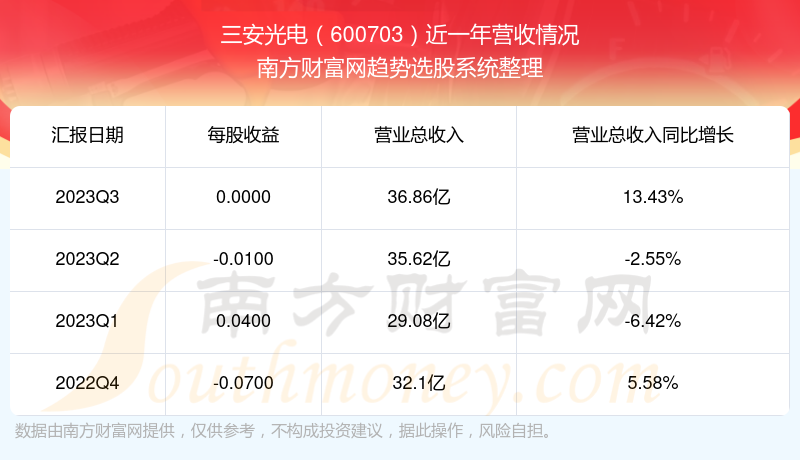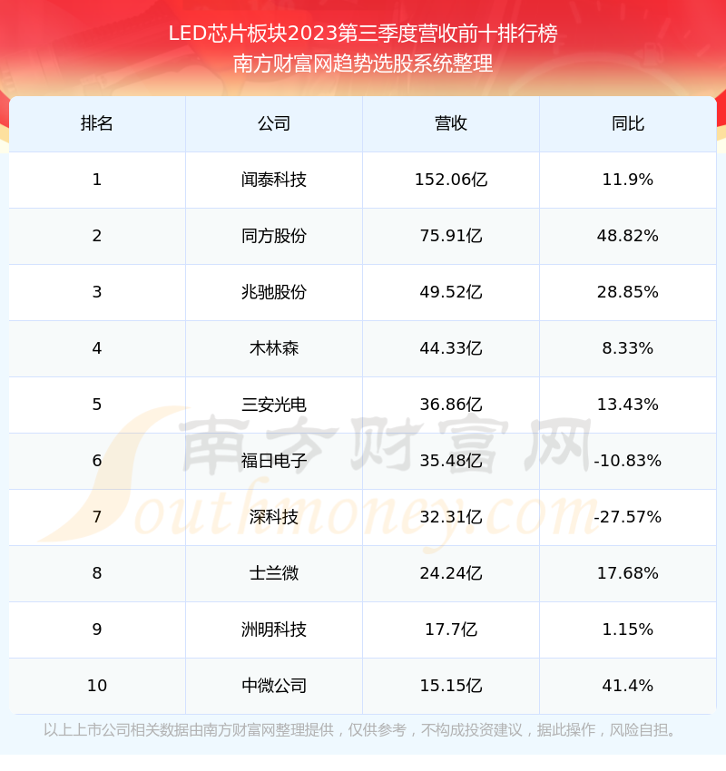 按照南方财富网趋势选股系统统计,该股所属板块为LED芯片板块,该板块共有32只股票,三安光电2023第三季度营收在该板块中排名为第5名,该板块2023第三季度营收排名前十的股票如下表: