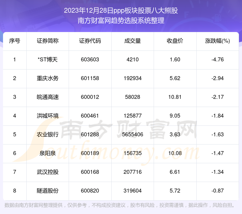 截止2023年12月28日,个股表现方面,ppp板块股票当日领跌股为*ST博天(603603),该股当日报收1.60,上涨-4.76%,成交量0.42万。重庆水务(601158)以下跌-2.94%紧随其后,该股当日成交量19.29万。此外,皖通高速(600012)、洪城环境(600461)、农业银行(601288)均进入当日ppp板块股票熊股之列。