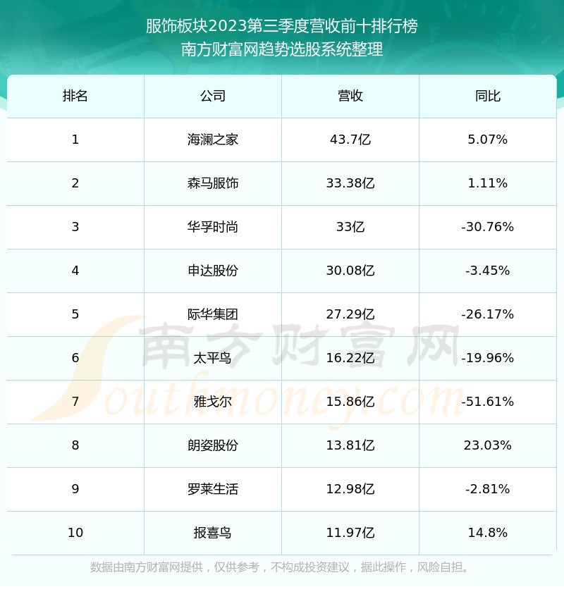按照南方财富网趋势选股系统统计,该股所属板块为服饰板块,该板块共有59只股票,海澜之家2023第三季度营收在该板块中排名为第1名,该板块2023第三季度营收排名前十的股票如下表: