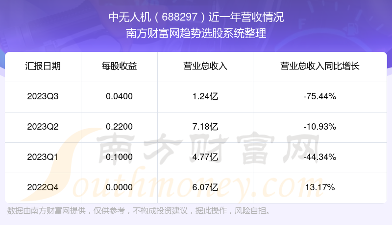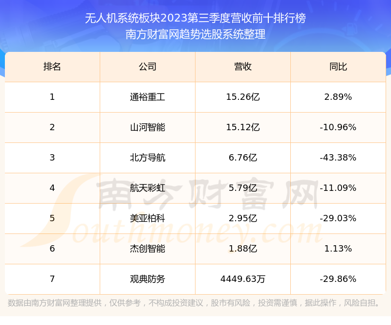 按照南方财富网趋势选股系统统计,该股所属板块为无人机系统板块,该板块共有7只股票,中无人机2023第三季度营收在该板块中排名为第7名,该板块2023第三季度营收排名前十的股票如下表: